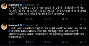 मायावती ने सोशल मीडिया प्लेटफॉर्म एक्स पर लिखा कि वर्तमान में रमजान चल रहा है और इसी दौरान होली का पर्व भी नजदीक है। ऐसे में उत्तर प्रदेश समेत पूरे देश की सरकारों को आपसी भाईचारे को बढ़ावा देना चाहिए। उन्होंने कहा कि किसी भी राजनीतिक लाभ के लिए इस अवसर का उपयोग करना उचित नहीं है। सभी धर्मों के अनुयायियों के सम्मान और भावनाओं का बराबर ध्यान रखा जाना चाहिए। उन्होंने यह भी कहा कि अधिकारियों को कानून-व्यवस्था बनाए रखने पर विशेष ध्यान देना चाहिए और उनका अनुचित उपयोग नहीं किया जाना चाहिए, जैसा कि संभल में देखने को मिला।