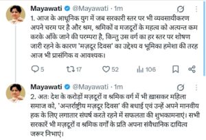 मायावती ने कहा कि आधुनिकता के इस युग में भी श्रमिकों की दशा में खास सुधार नहीं आया है। चाहे खेतों में काम हो, निर्माण स्थल हो या फैक्ट्रियों में पसीना बहाने का मामला – हर जगह मजदूरों को उनके हक और सम्मान से वंचित रखा जा रहा है। ऐसे में मजदूर दिवस केवल एक तारीख नहीं, बल्कि उनके संघर्ष और बलिदान को याद करने का दिन है।