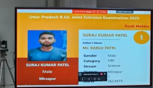 इस बार मिर्जापुर के सूरज पटेल ने बीएड परीक्षा में पहला स्थान हासिल किया है। वहीं, भदोही की शिबा प्रवीण को दूसरा और जौनपुर की शिवांगी यादव को तीसरा स्थान मिला है।