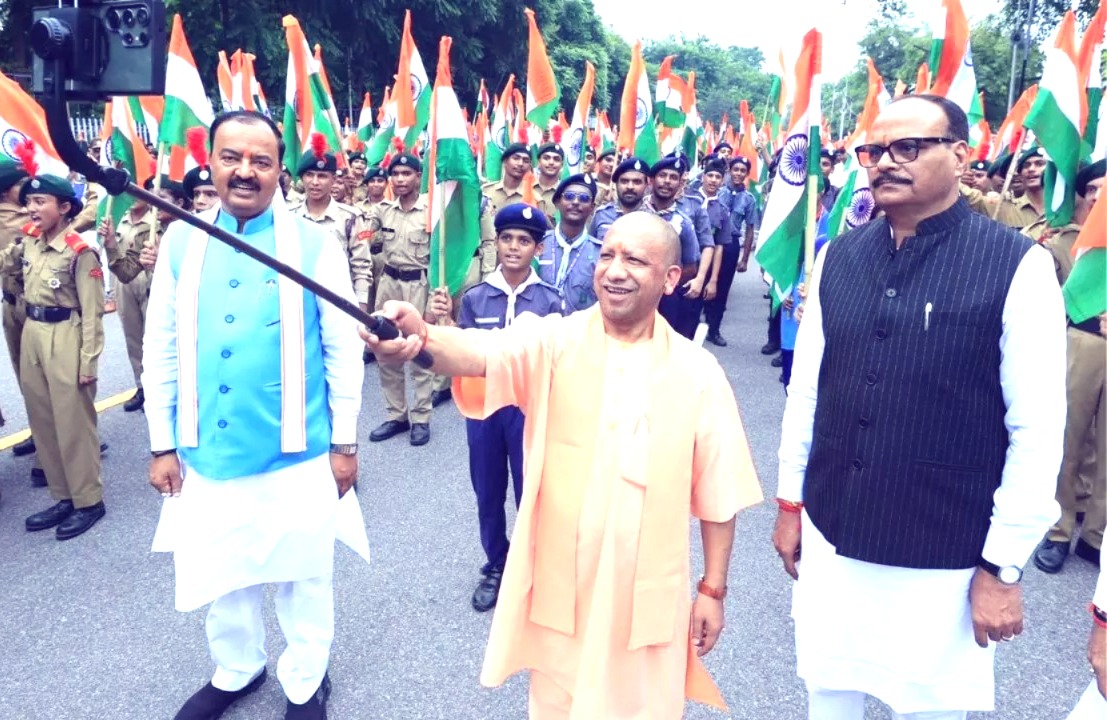 लखनऊ। उत्तर प्रदेश के मुख्यमंत्री योगी आदित्यनाथ ने आज राजधानी लखनऊ में ‘हर घर तिरंगा’ अभियान का औपचारिक शुभारंभ किया। इस मौके पर उनके साथ उपमुख्यमंत्री ब्रजेश पाठक और केशव प्रसाद मौर्य भी मौजूद रहे। तीनों नेताओं ने हाथ में तिरंगा थामकर सेल्फी ली, जिसकी तस्वीर सोशल मीडिया पर तेजी से वायरल हो रही है।