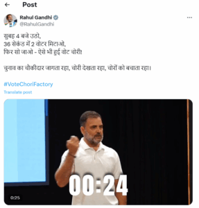 राहुल गांधी ने सोशल मीडिया पर एक 36 सेकंड का वीडियो साझा करते हुए लिखा— “सुबह 4 बजे उठो, 36 सेकंड में 2 वोटर मिटाओ, फिर सो जाओ— ऐसे भी हुई वोट चोरी!” उन्होंने आरोप लगाया कि चुनाव आयोग ने न केवल इस प्रक्रिया को नजरअंदाज किया बल्कि इसमें शामिल लोगों को बचाने का भी काम किया।