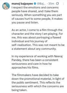 विवाद बढ़ने के बाद फिल्म से जुड़े अभिनेता मनोज बाजपेयी का भी बयान सामने आया है। उन्होंने सोशल मीडिया के माध्यम से कहा कि वह सभी लोगों की भावनाओं का सम्मान करते हैं और किसी भी समुदाय को ठेस पहुंचाने का उनका कोई इरादा नहीं था। अभिनेता ने यह भी जानकारी दी कि जनभावनाओं को ध्यान में रखते हुए फिल्म से जुड़े प्रमोशनल मटीरियल हटाने का निर्णय लिया गया है। फिलहाल पुलिस मामले की जांच कर रही है और आगे की कार्रवाई साक्ष्यों और जांच के निष्कर्षों के आधार पर की जाएगी।